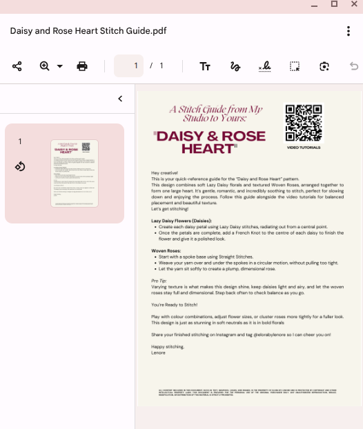 • Printable Daisy and Rose Heart pattern (2 pages) (PDF); 3 Hearts; a Large, Medium & Small and Written Stitch Guide with all of my go to recommended Stitches to use for this design.