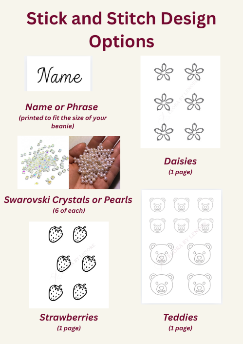 Please select your beanie colour and size, then your design option! Various decision boxes will pop up as you go through your selections.