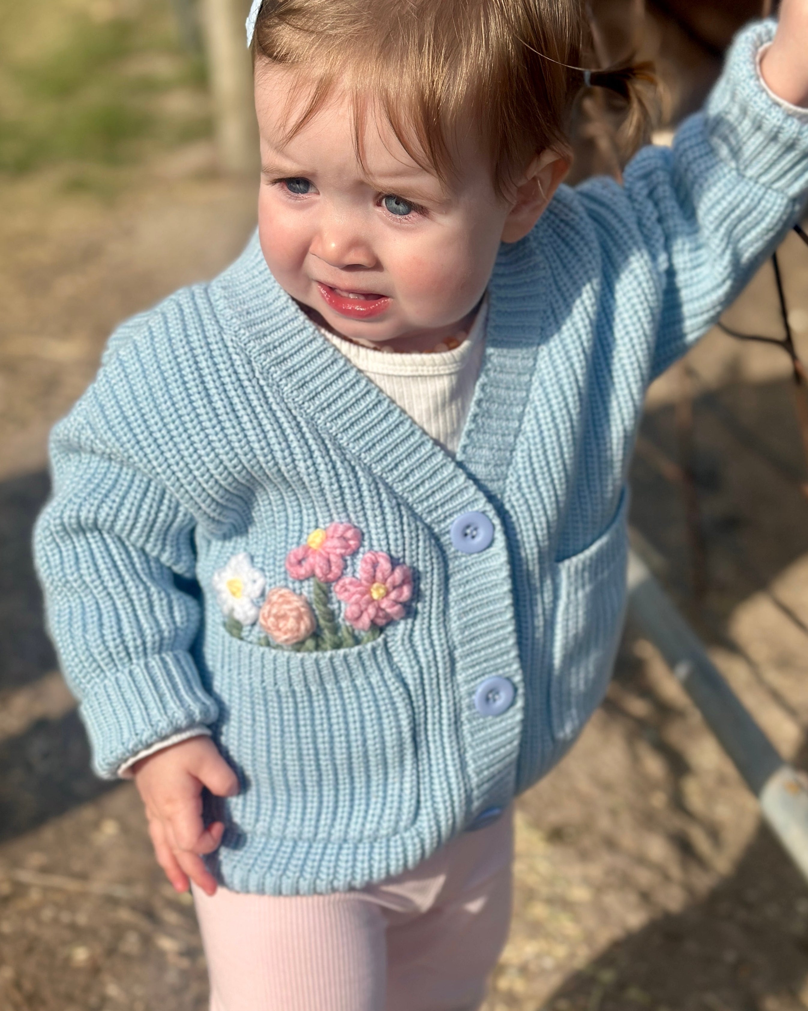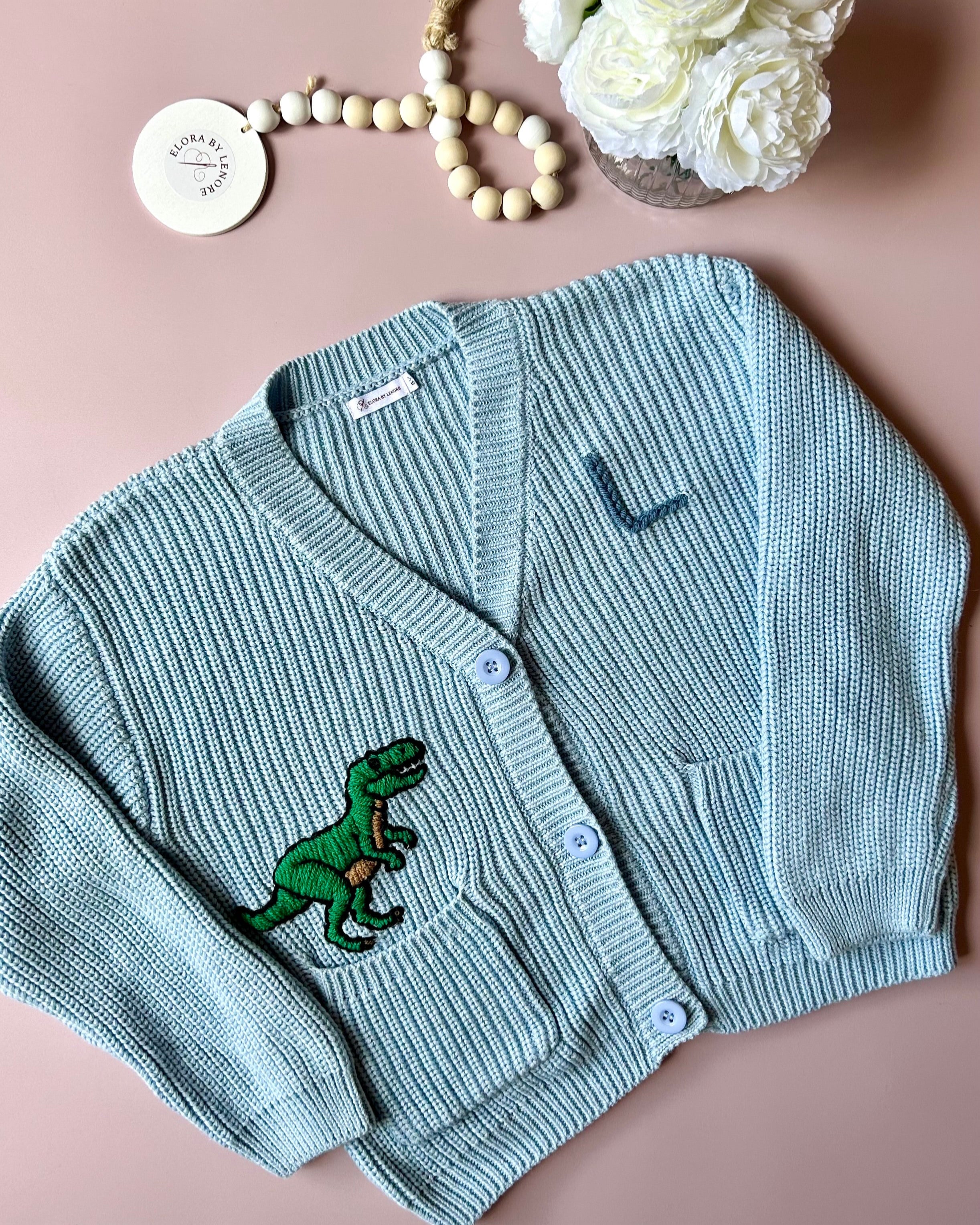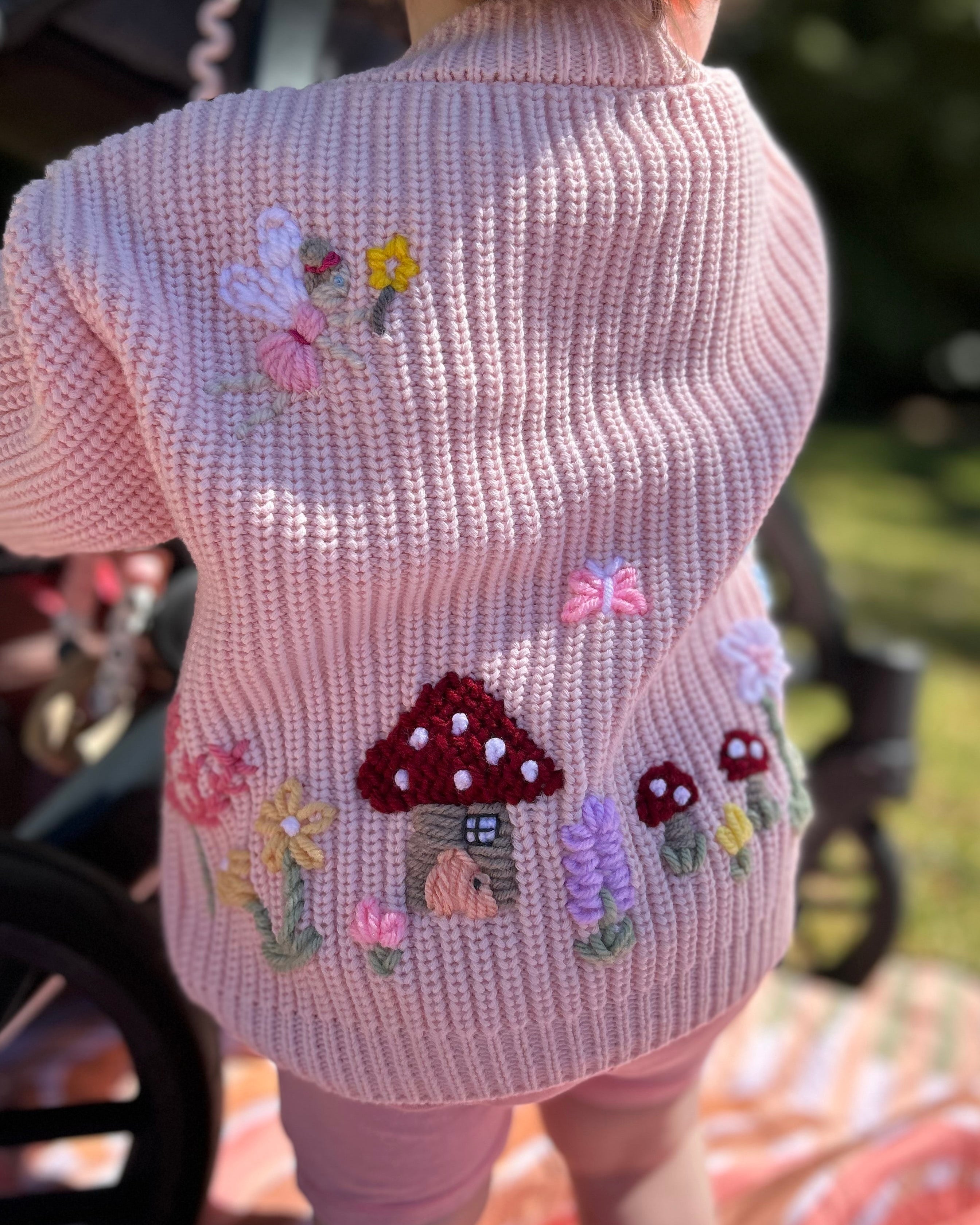 How it works; select your colour and size cardigan, choose the design or add on pieces you’d like (these prices vary depending on complexity), tell me any specific visions you have and I’ll stitch them into life!