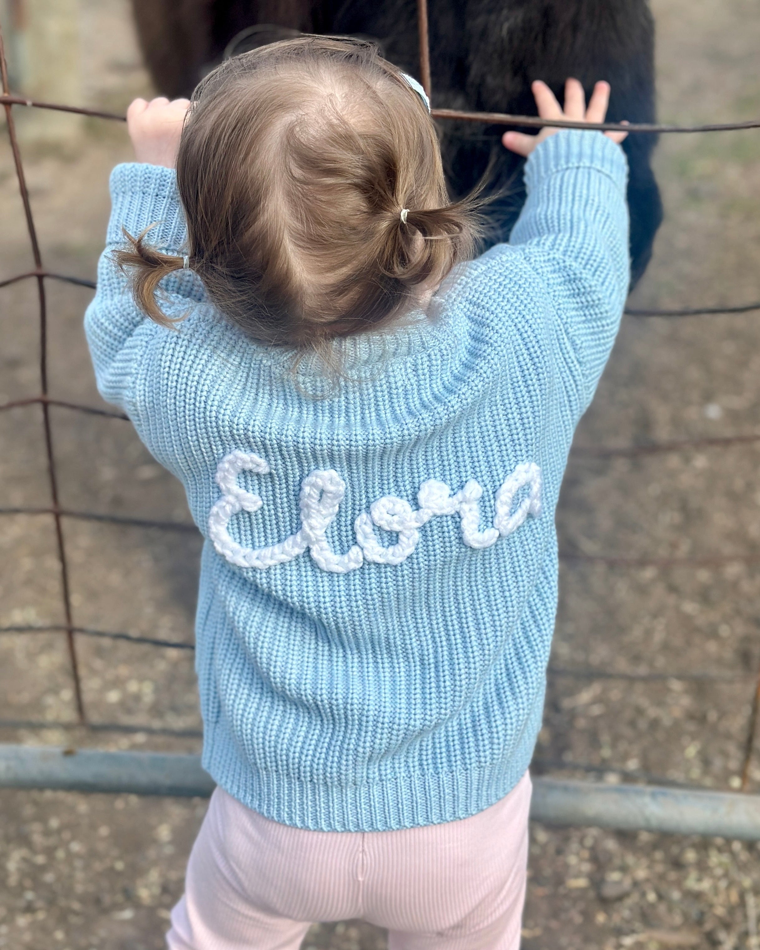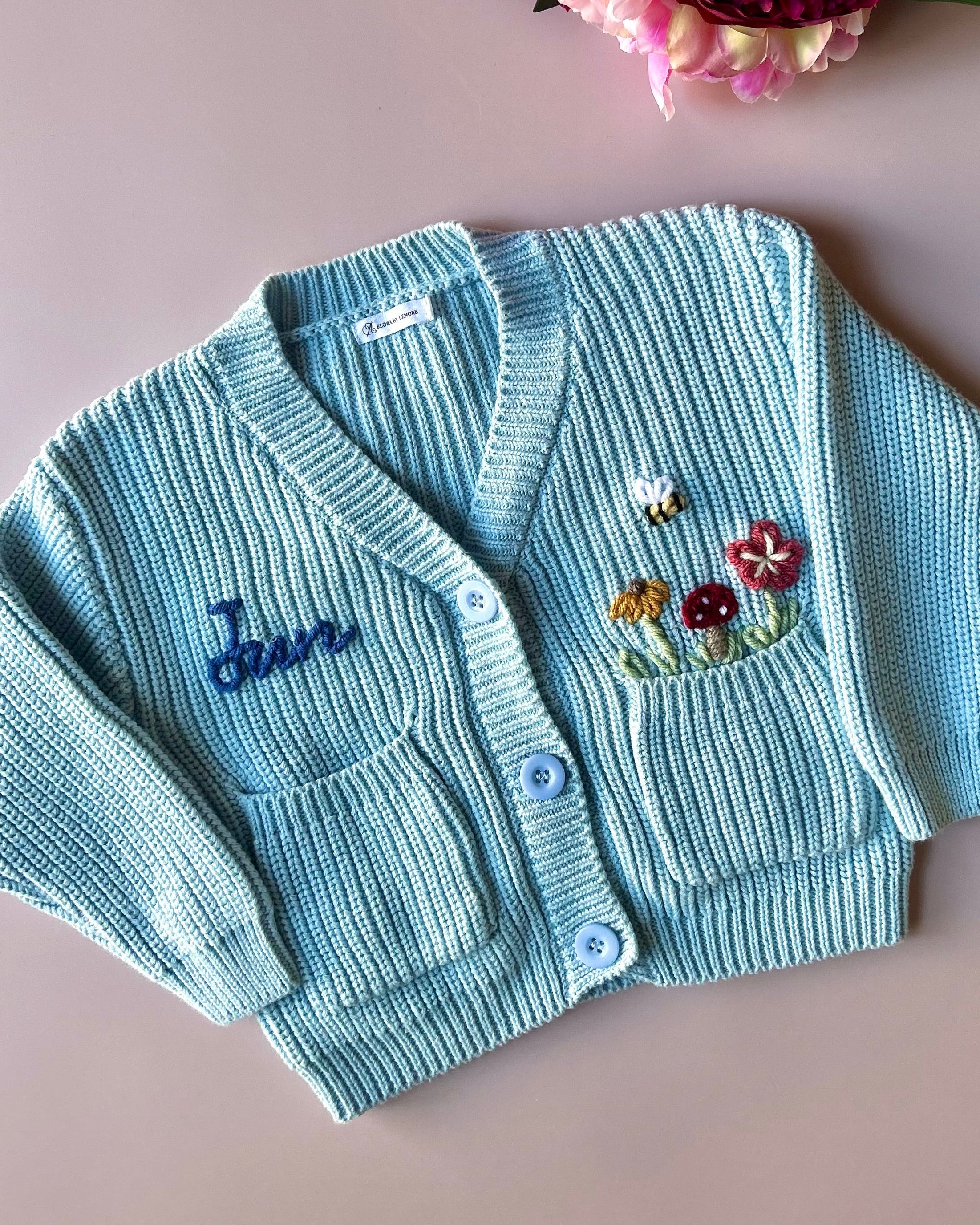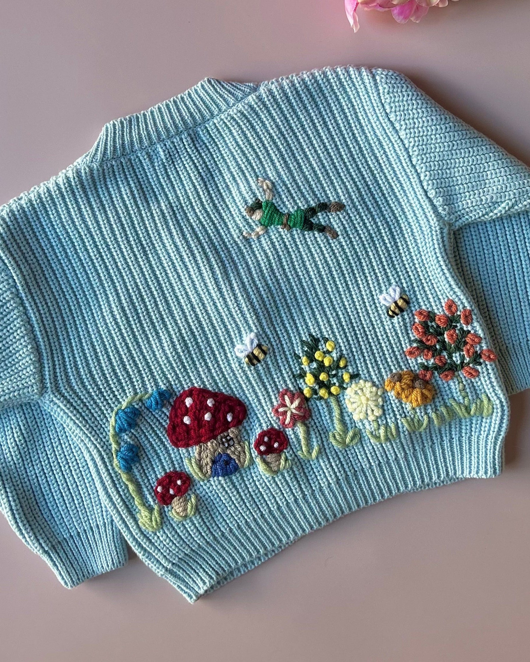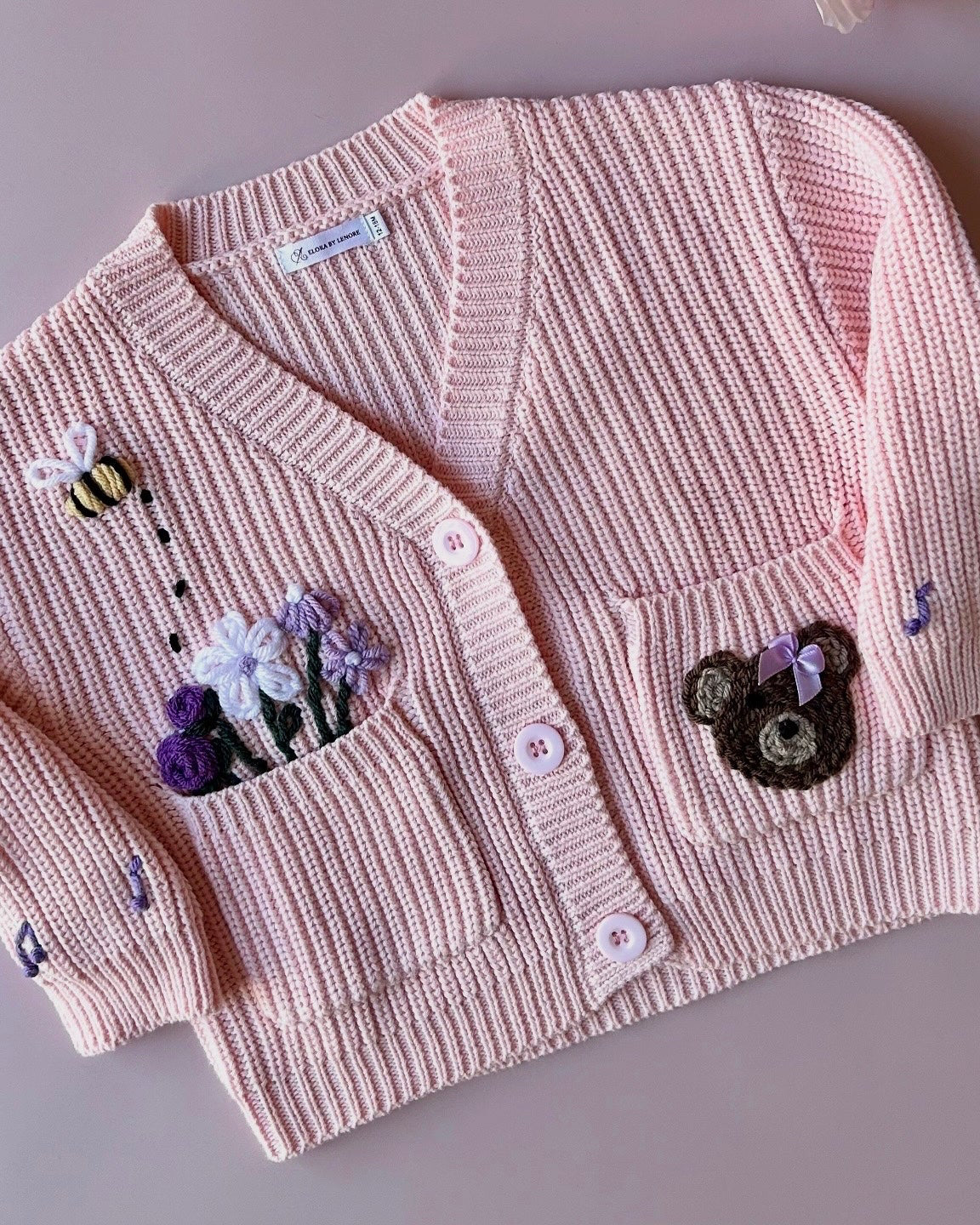 How it works; select your colour and size cardigan, choose the design or add on pieces you’d like (these prices vary depending on complexity), tell me any specific visions you have and I’ll stitch them into life!