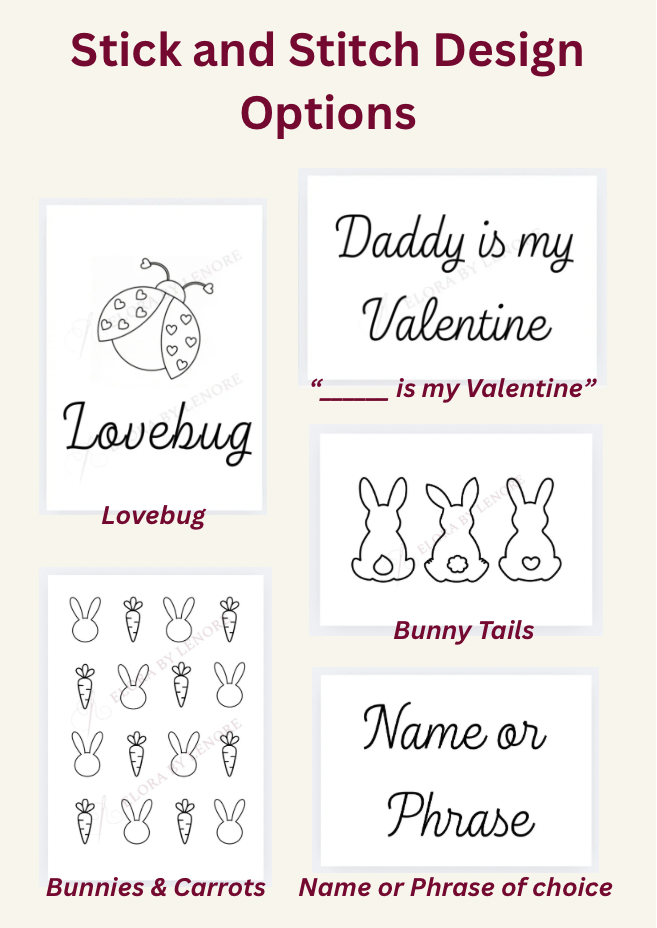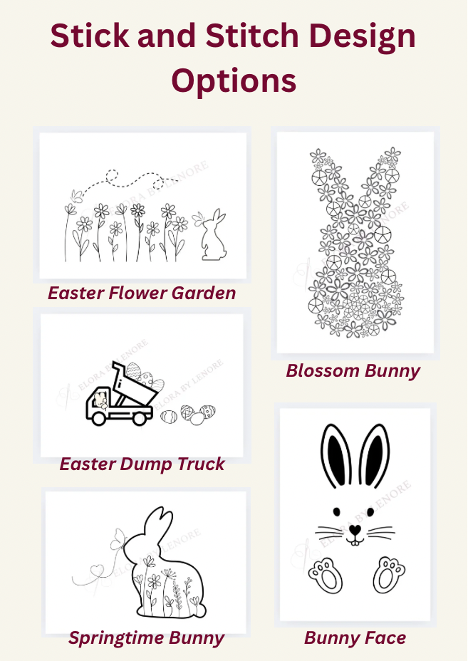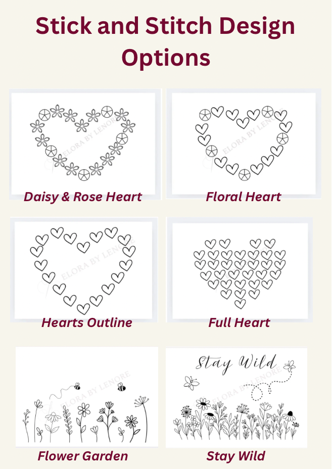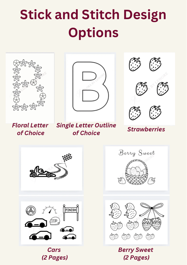 Please Note: If you choose the Fairy Garden design, it is priced $7 higher due to the inclusion of extra materials, including a third page of Stick & Stitch designs, DMC embroidery thread for fine details (such as the fairy’s eyes, hair bow, and dress belt), and a smaller needle for precision work.