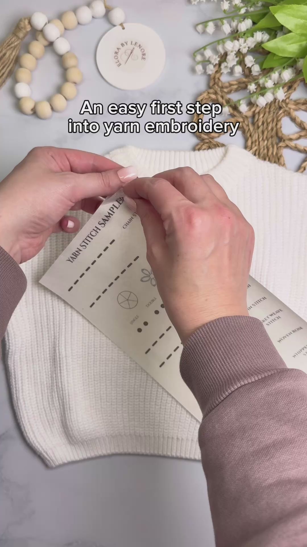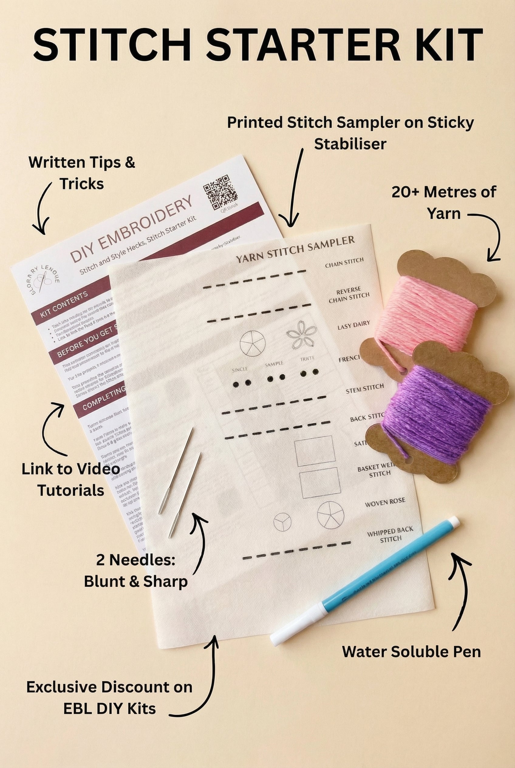 The Stitch Starter Kit is the perfect starting point for beginners or anyone wanting to refresh their embroidery skills. Designed as the first step before tackling an EBL design, this kit teaches you all of the core yarn embroidery stitches you’ll need to confidently complete any Elora by Lenore project.